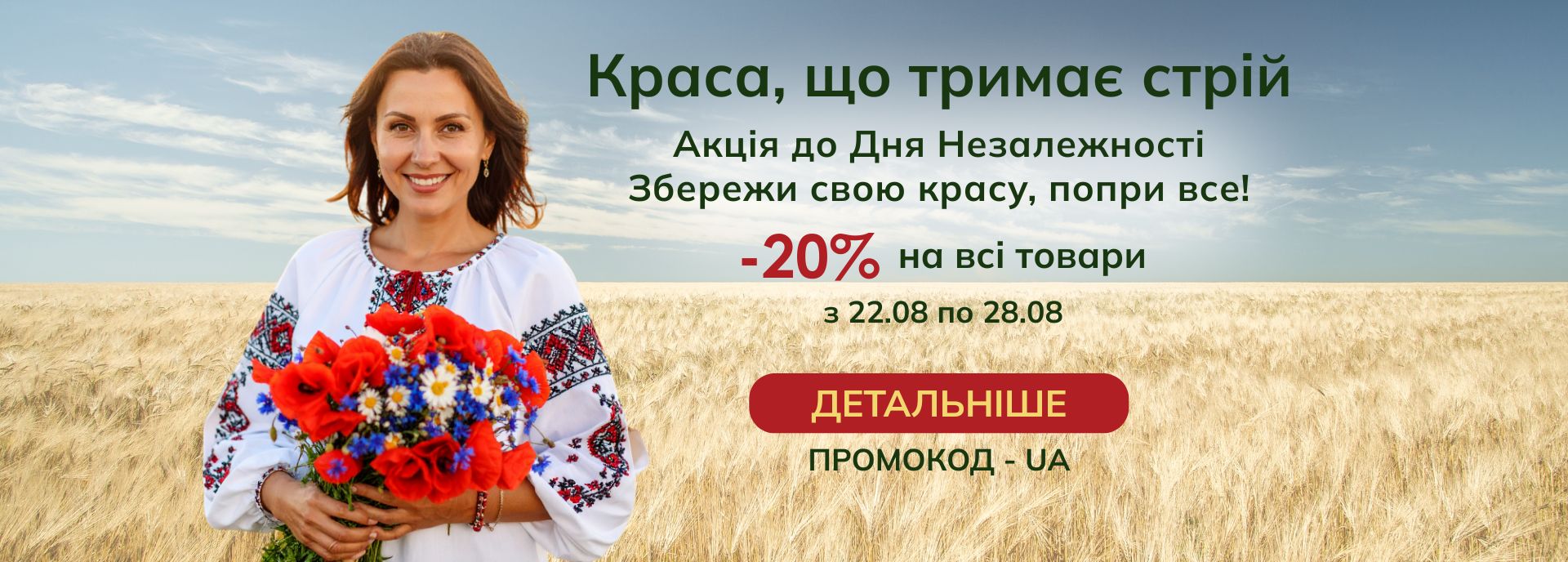 Лише з 22.08 по 28.08 діє святкова пропозиція: –20% на весь асортимент, окрім товарів із категорії «АКЦІЇ». Це чудова нагода потішити себе та зробити подарунки рідним у дні, коли ми святкуємо Незалежність нашої країни.